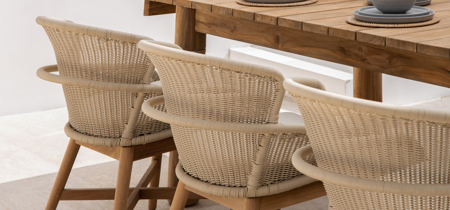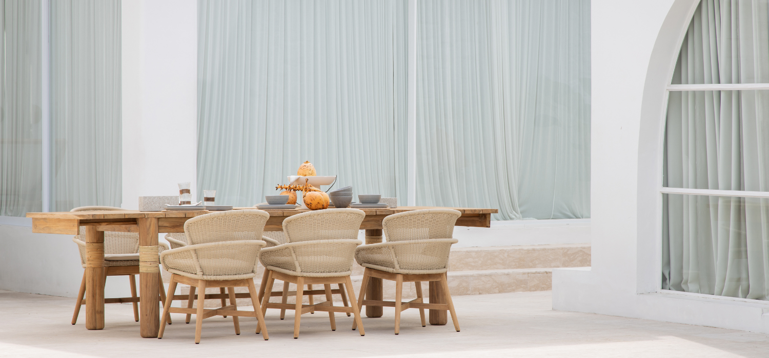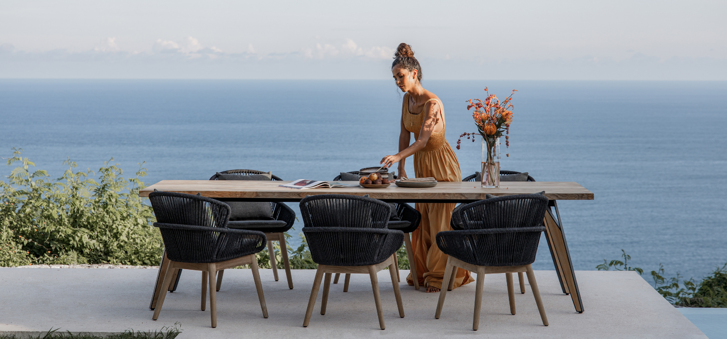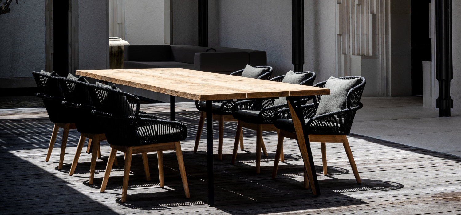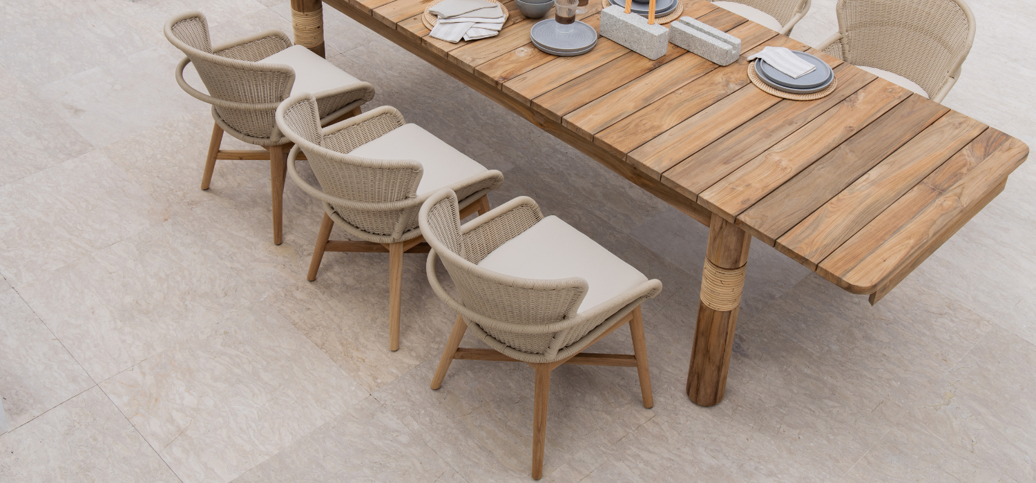 Altea’s collection combines style and functionality, comprising elegant dining chairs. These chairs are crafted with a round rope wrapped around a sturdy aluminum frame. The addition of teak legs further enhances the classic charm of the dining chairs.