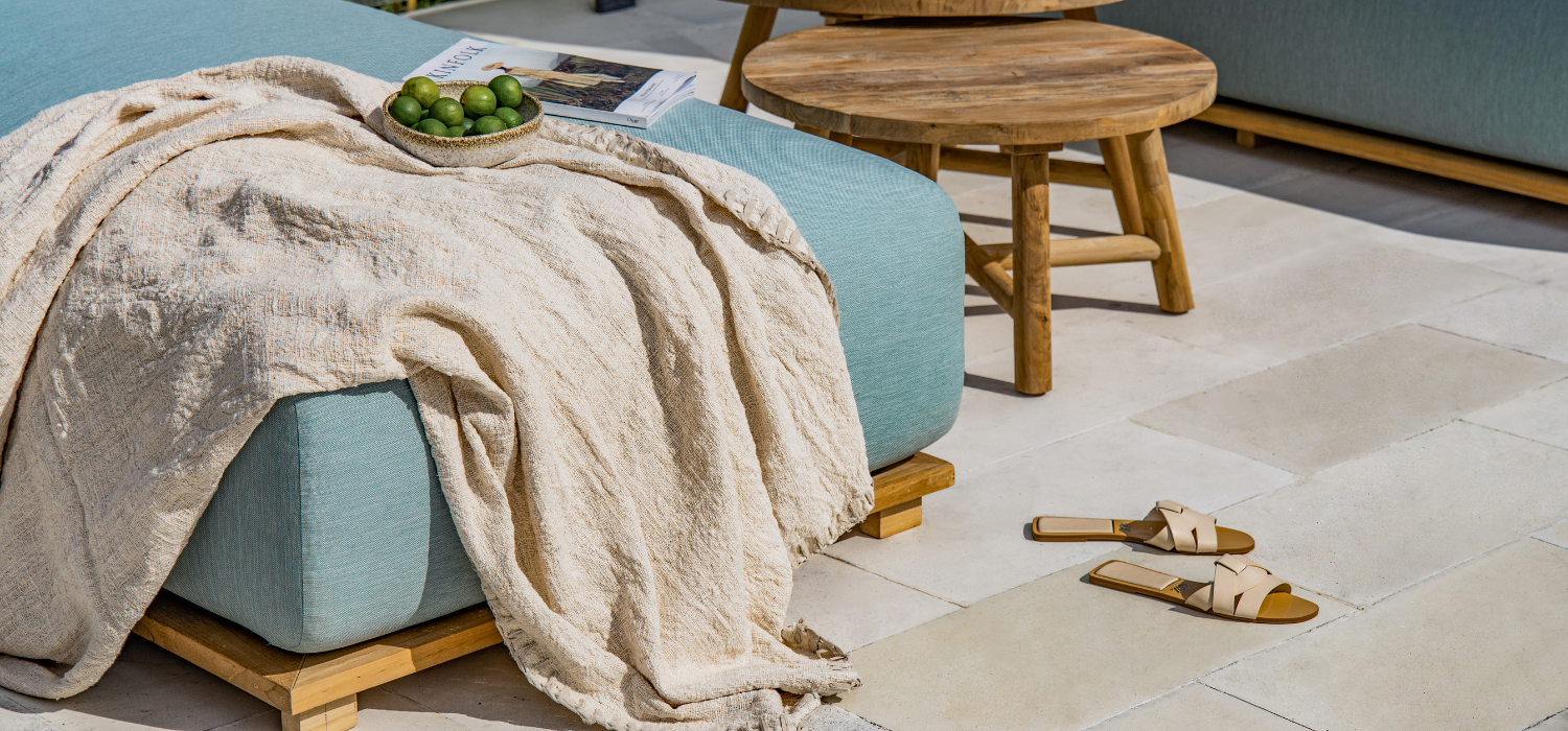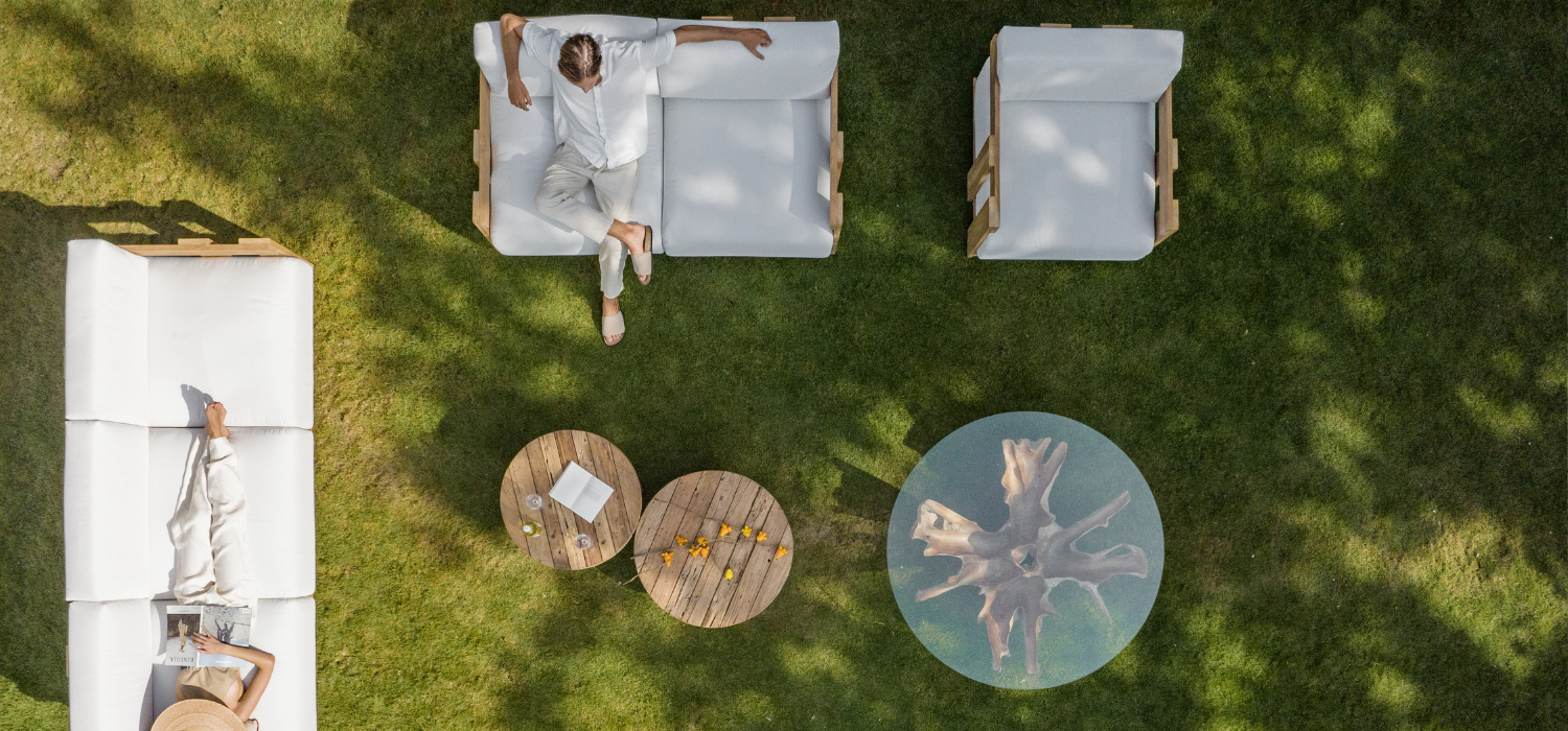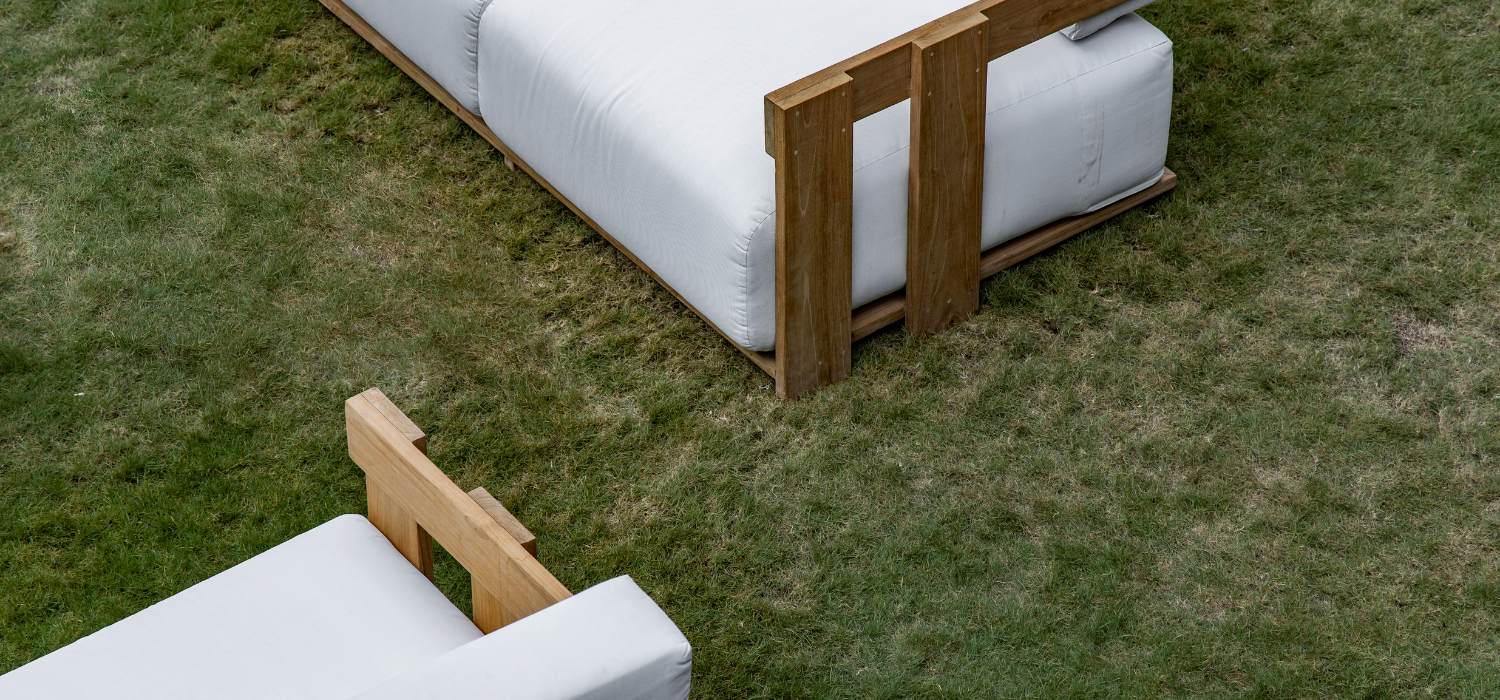 The discreet protagonist of the Axis collection is wood. All the upholstered furniture of this line shares a slim seat in natural teak wood which supports generously-sized cushions enclosed by armrests with geometric lines. The collection comprises lounge chairs, sofas and other pieces of furniture – including a bar table – that can be combined to create a comfortable, customised space.