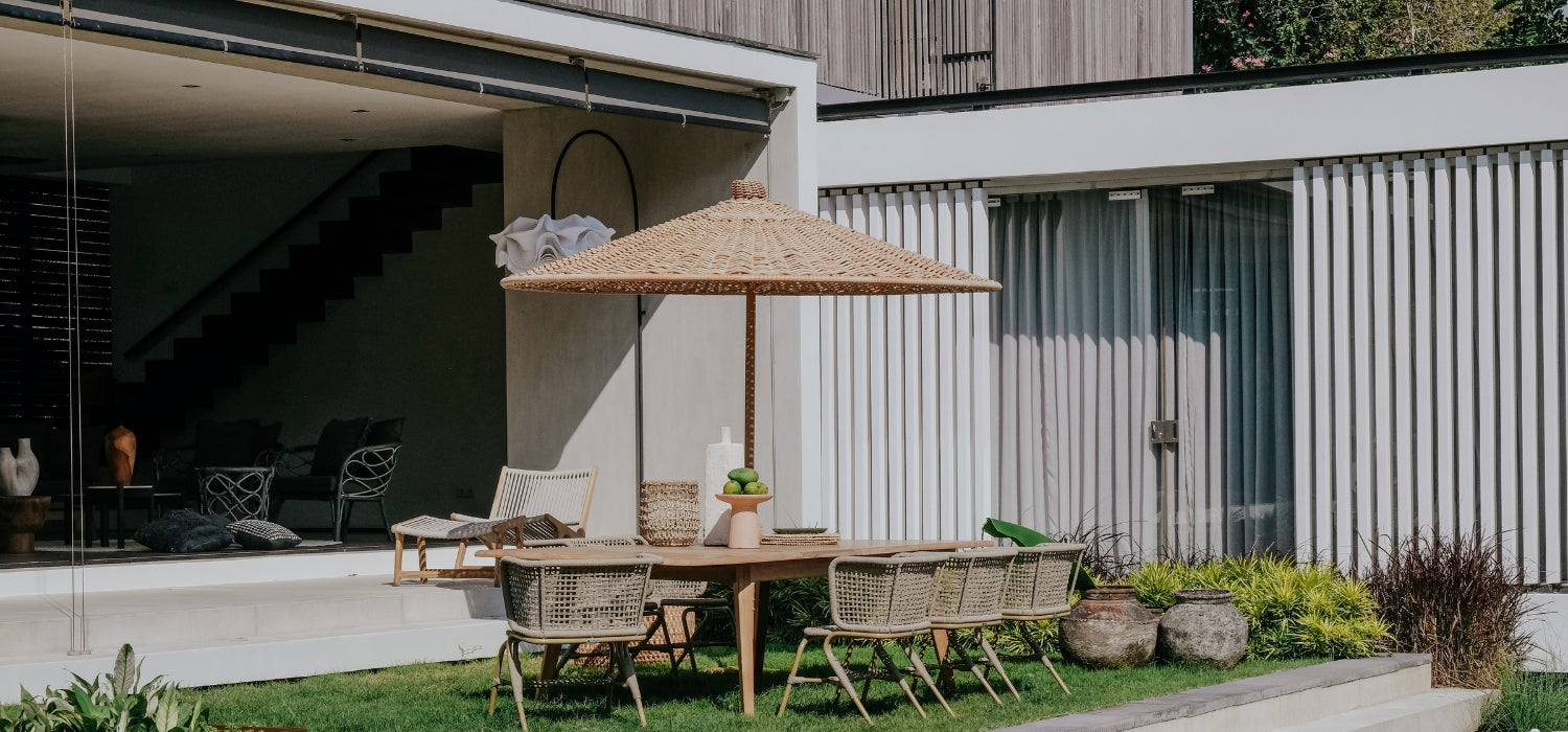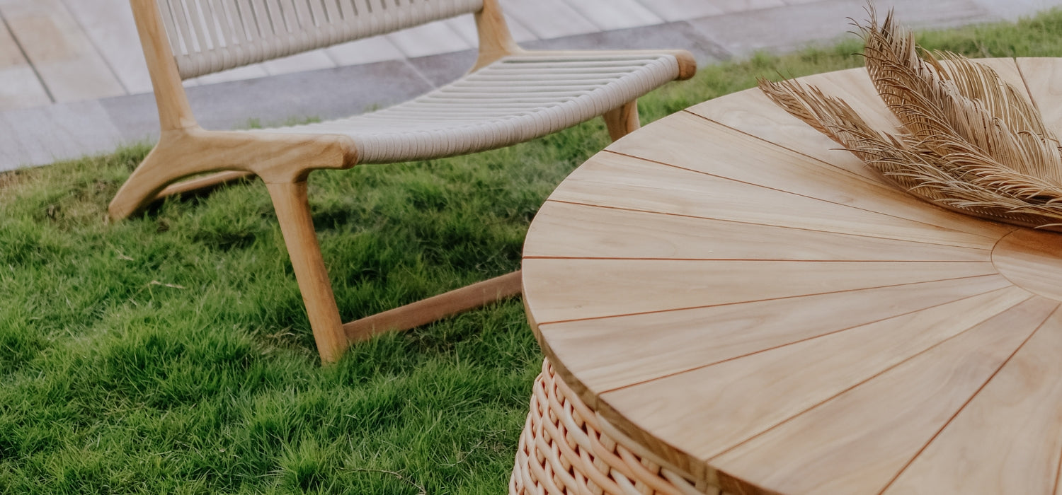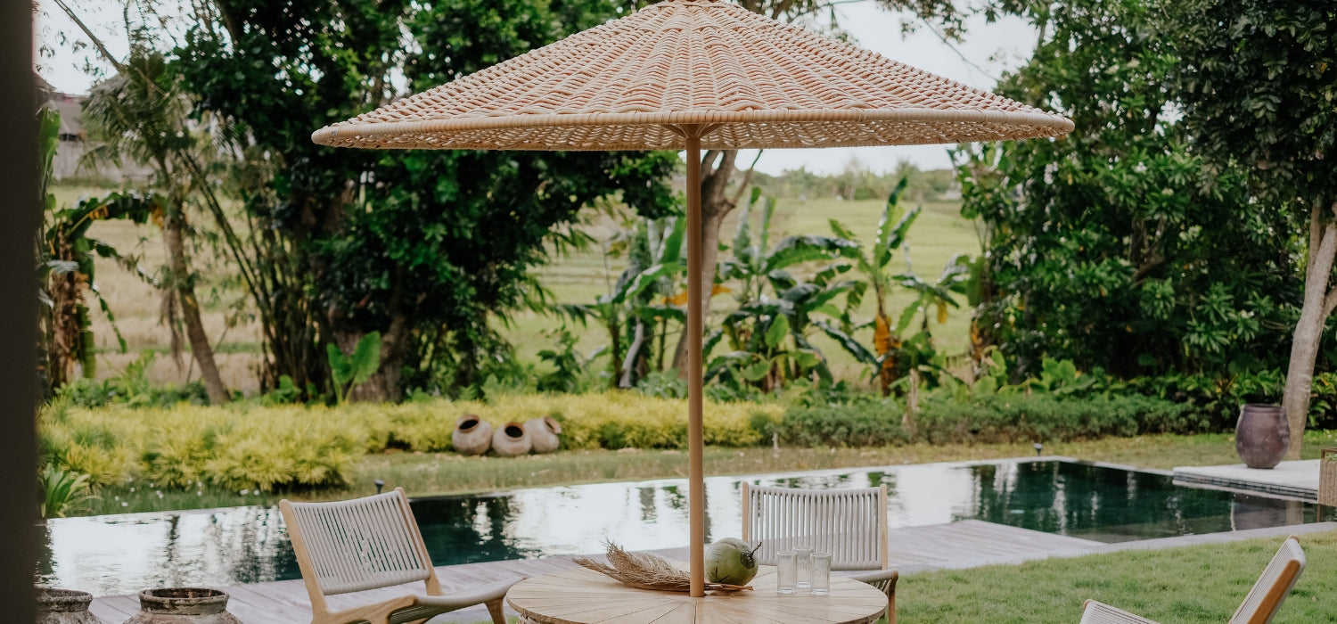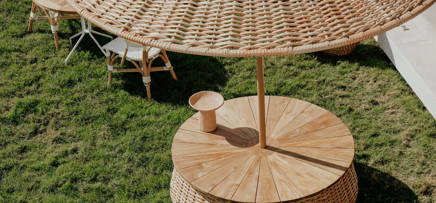 Inspired by the Caribbean sun, the Caribbean sun umbrella is made up of two parts. The umbrella can be used all by itself or paired with a coffee table with a teak top.