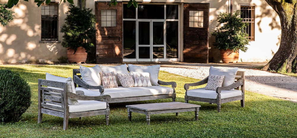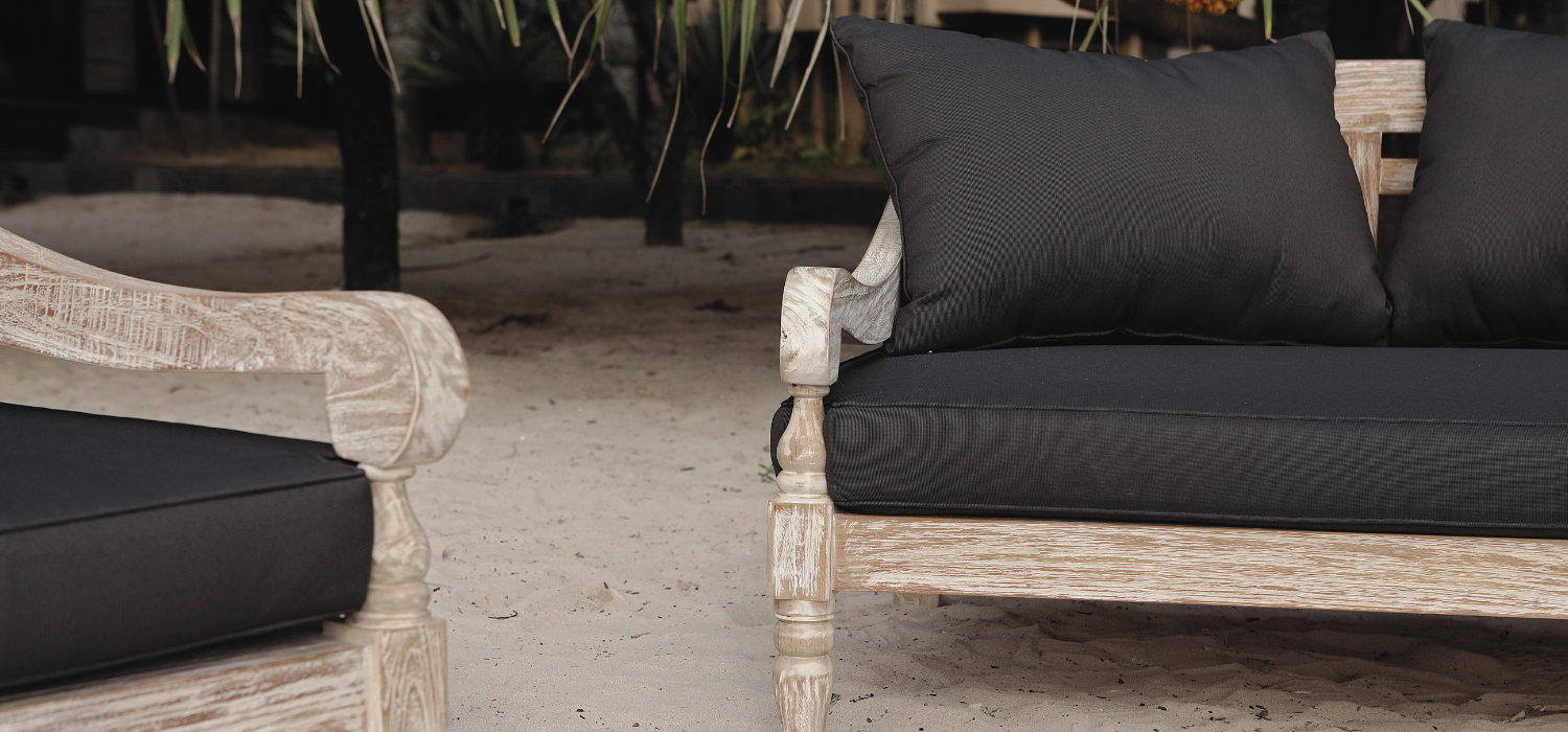 of sofas, lounge chairs, tables and coffee tables in teak and available in