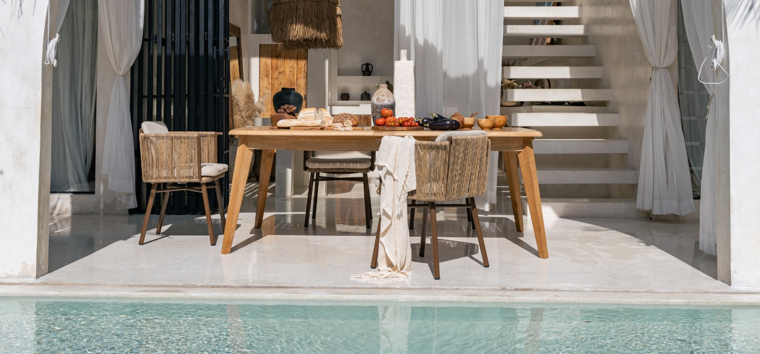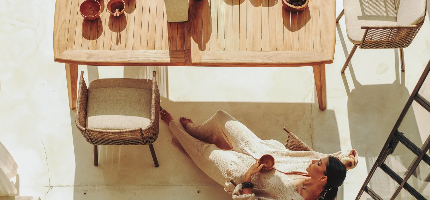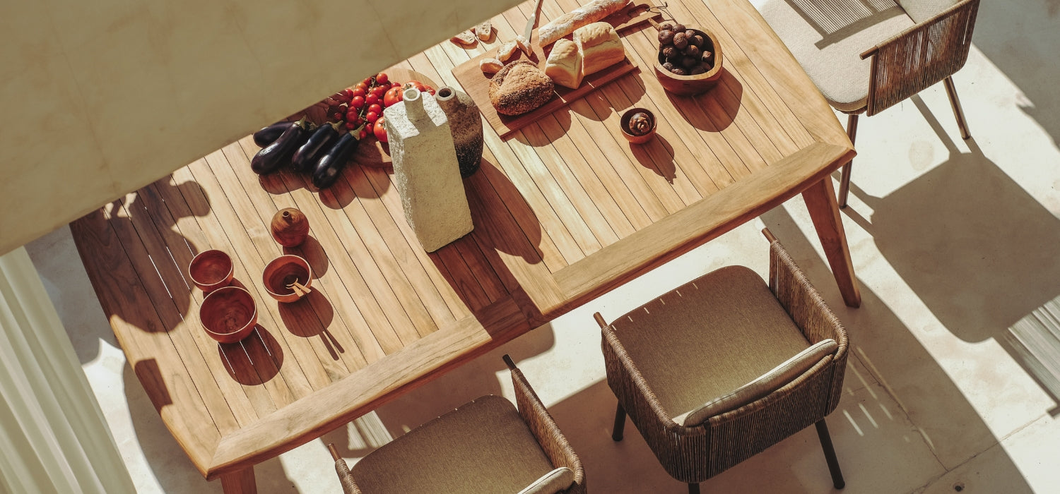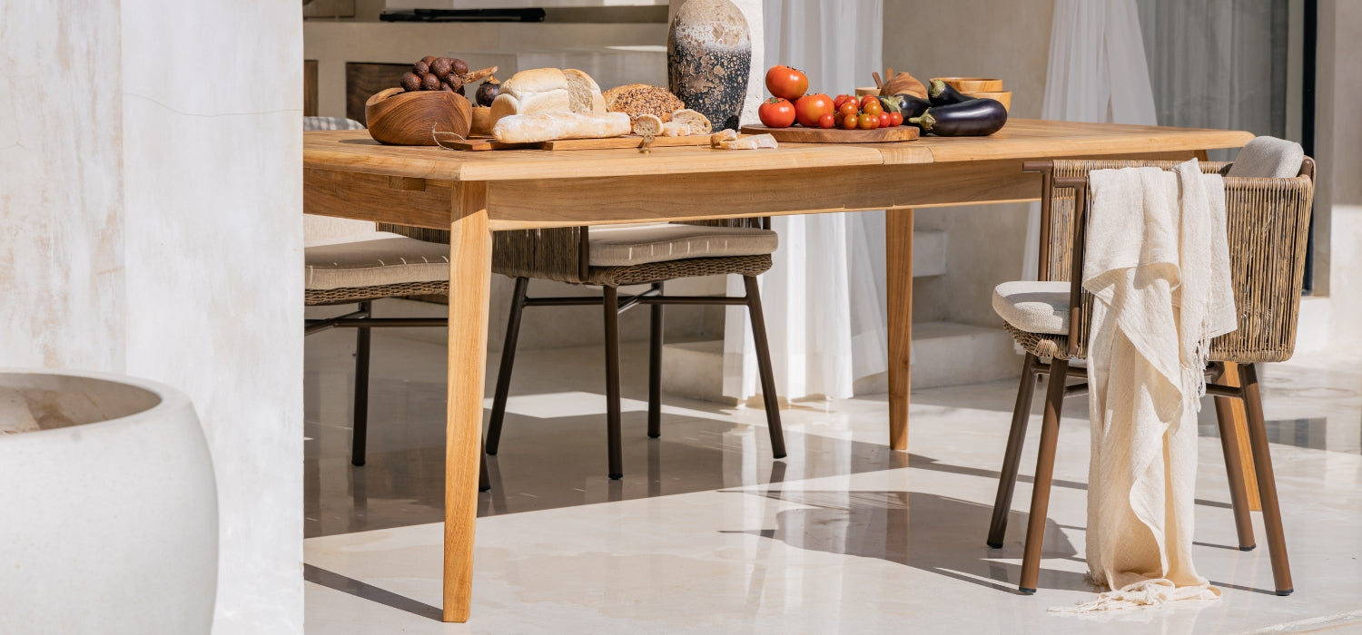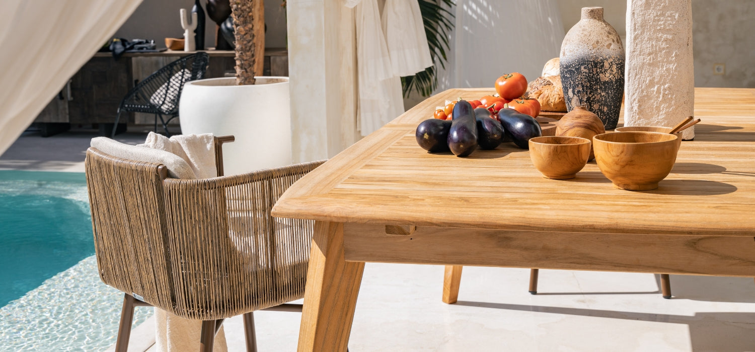 chaise longues and tables made of teak wood, perfectly