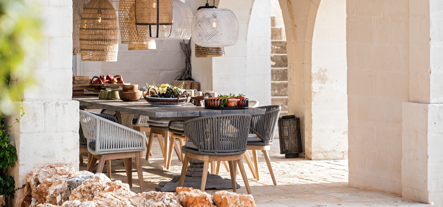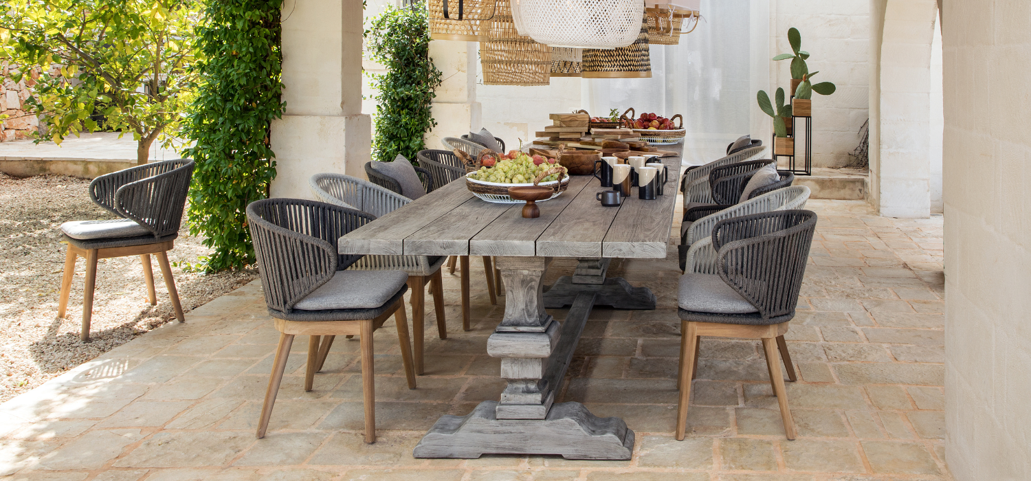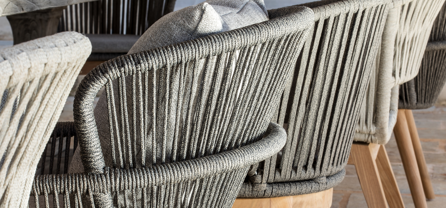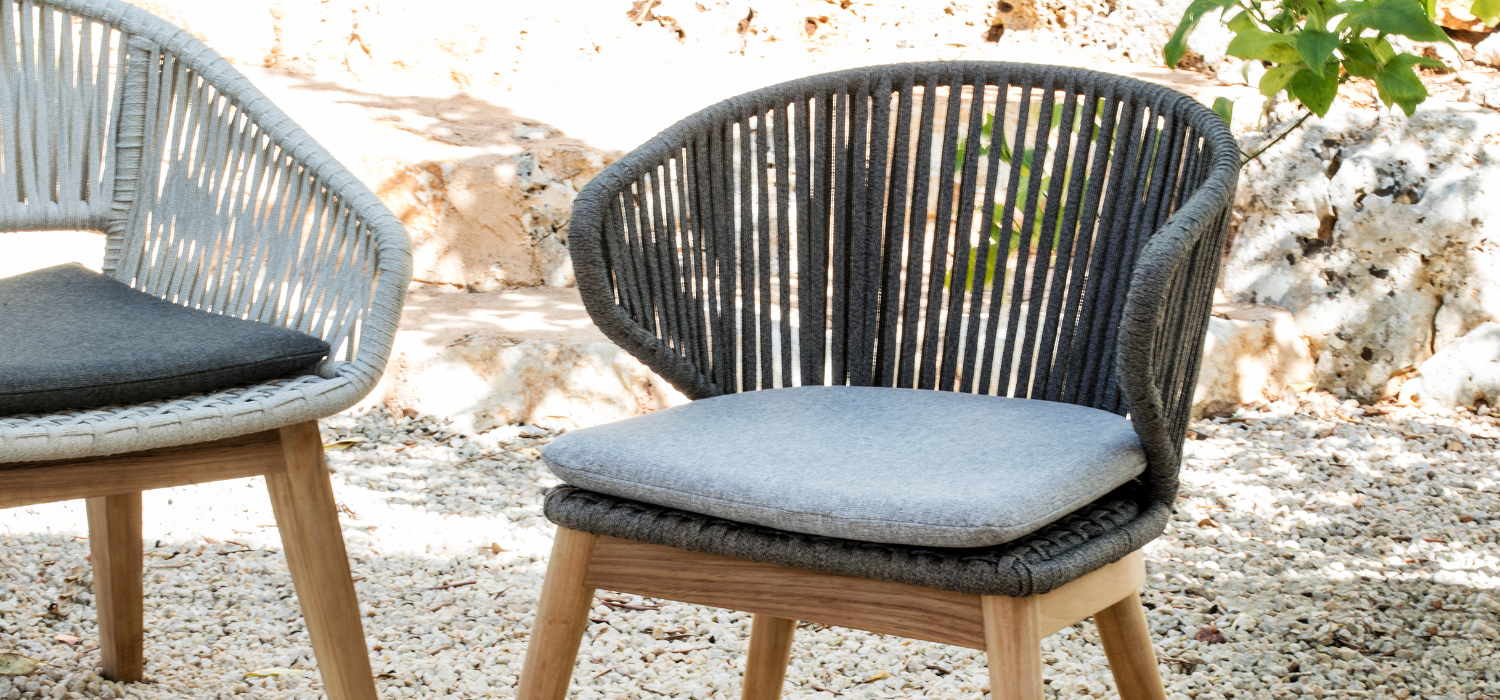 The Dafne chair combines a natural teak frame with a curvy, wraparound back in woven rope. Comfortable and cosy, it makes outdoor convivial moments even more enjoyable.
