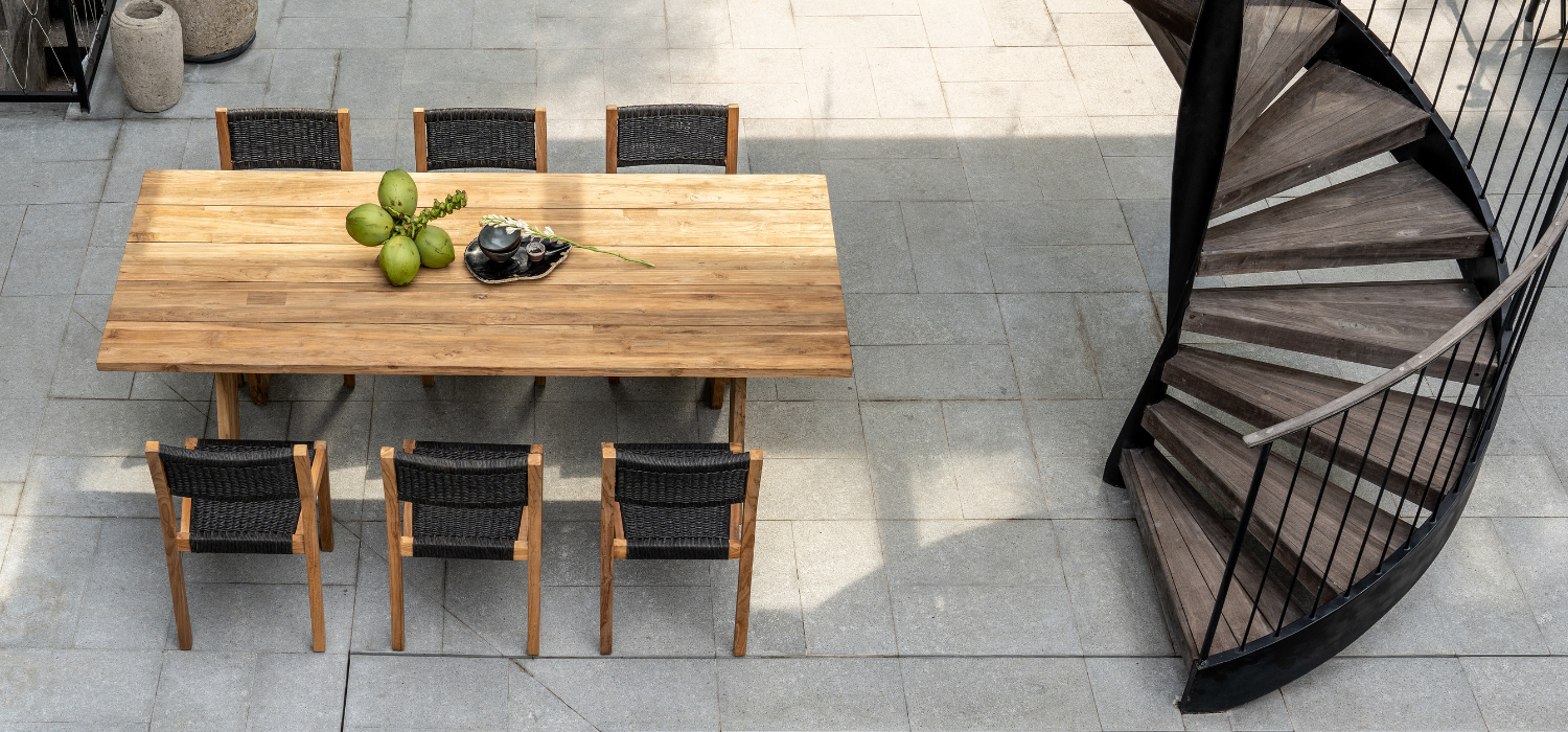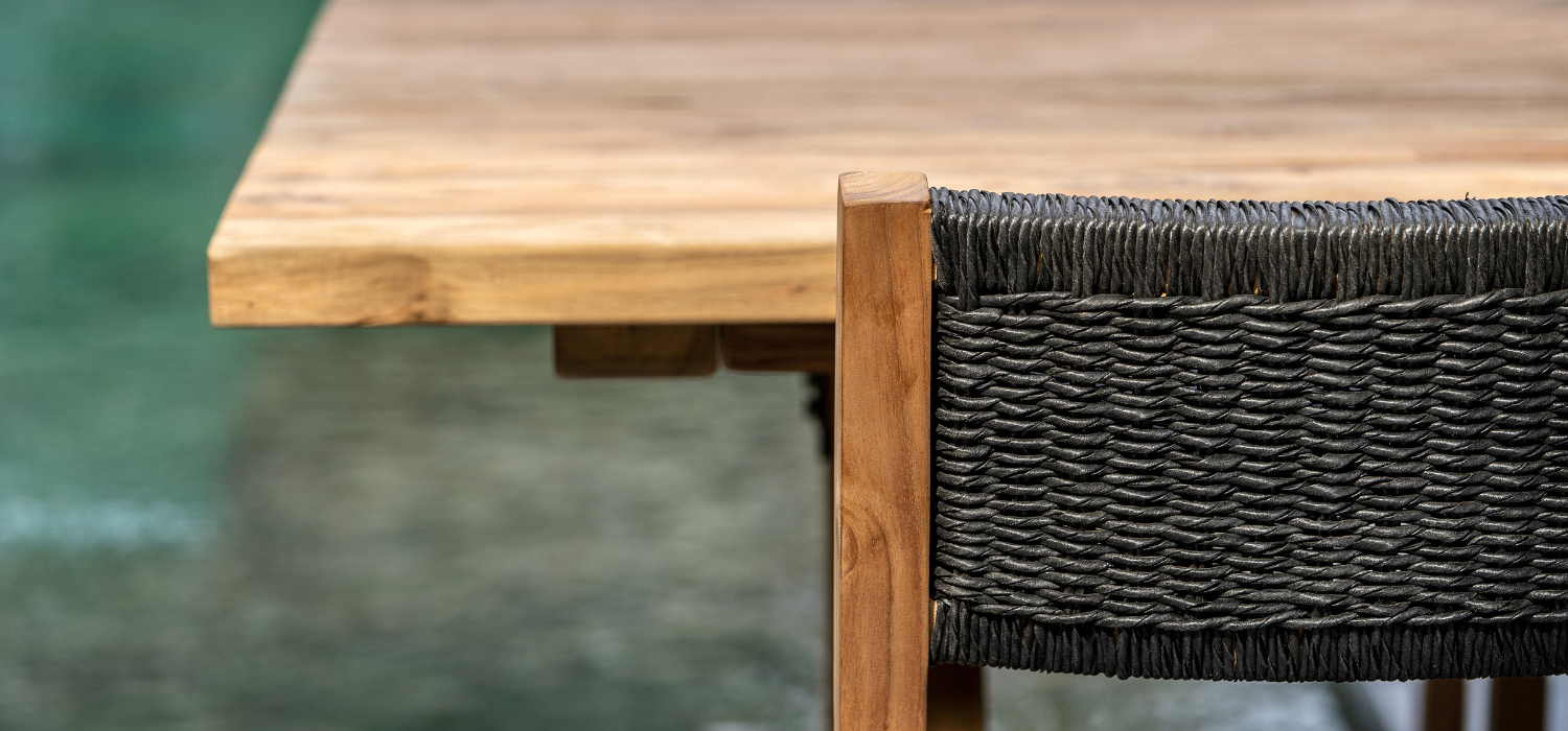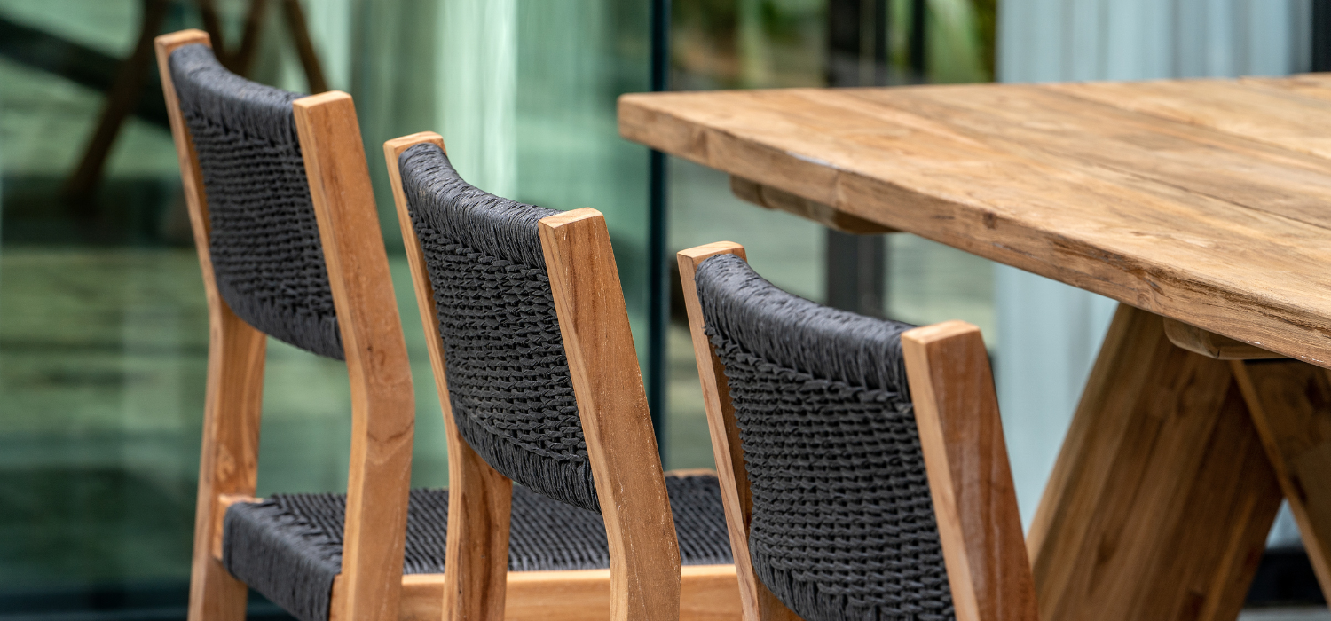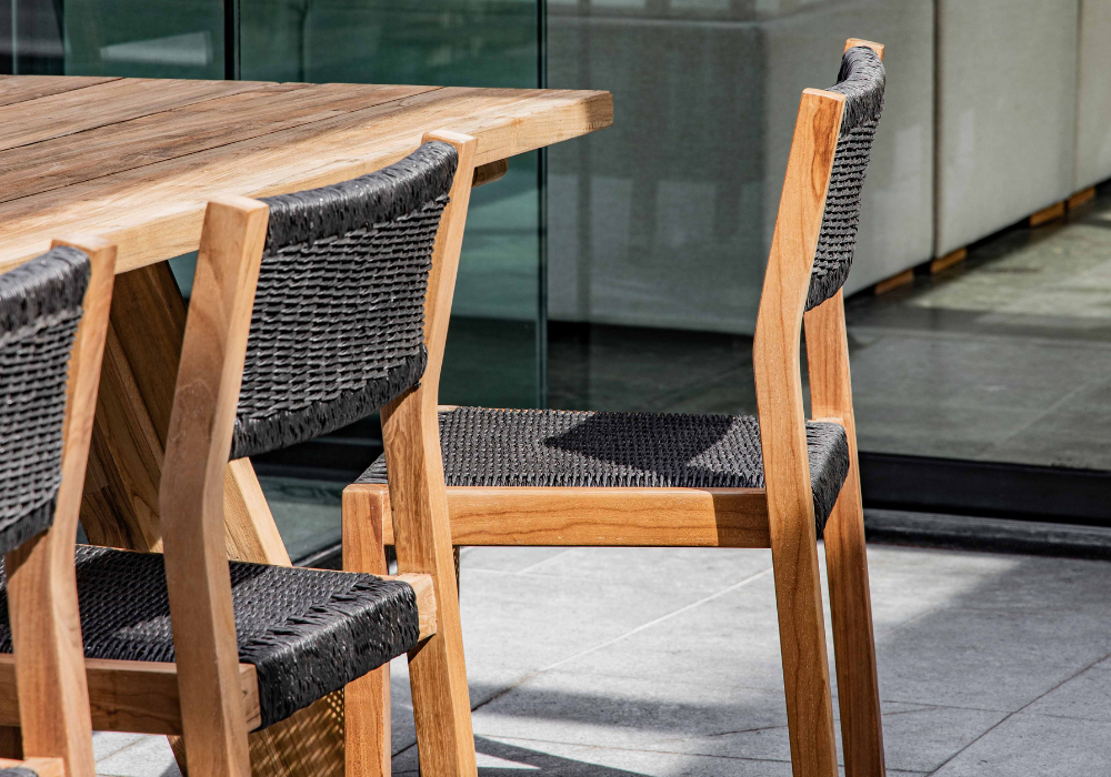 A collection of dining chairs that combines the timeless beauty of natural teak wood with an intricate design crafted from 4 mm twisted synthetic rope that adds a modern and unique element to the chairs, enhancing their visual appeal and ensuring maximum comfort.