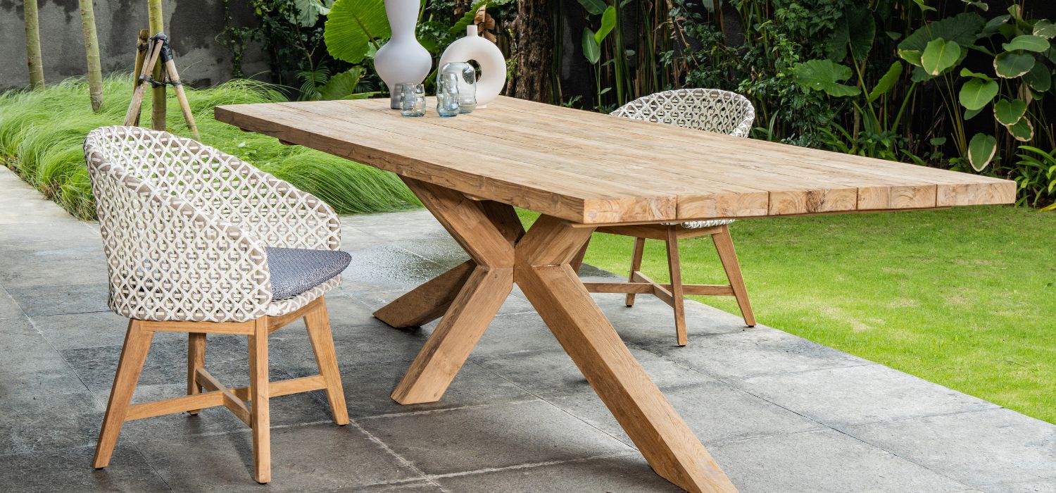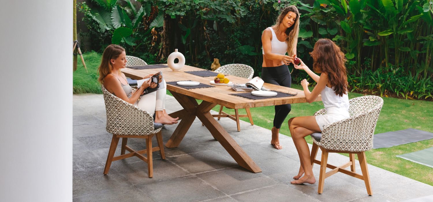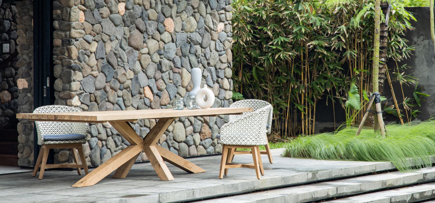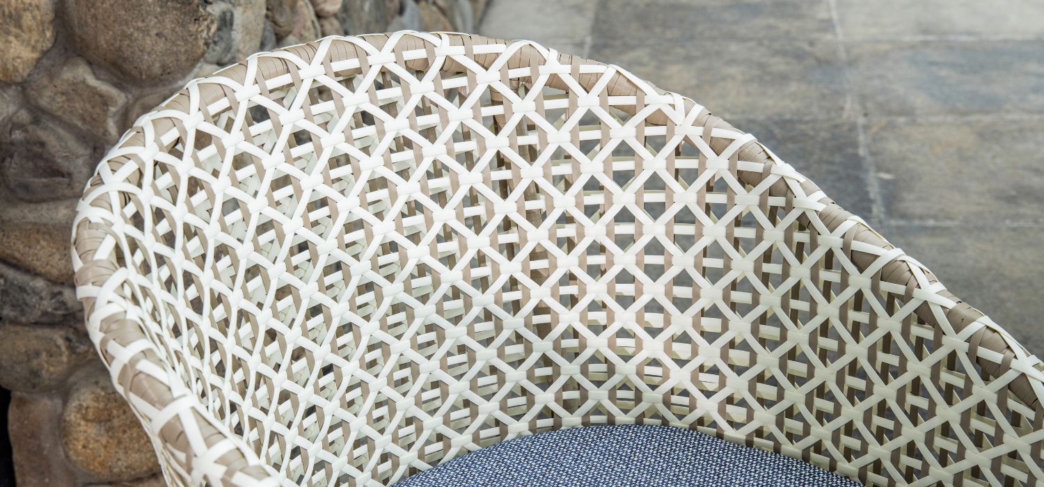 A compact, wraparound chair winks at the world of haute-couture fashion thanks to its open, flat rope weave in classic black and white reminiscent of houndstooth tweed. The chair’s natural teak legs add warmth to the design.