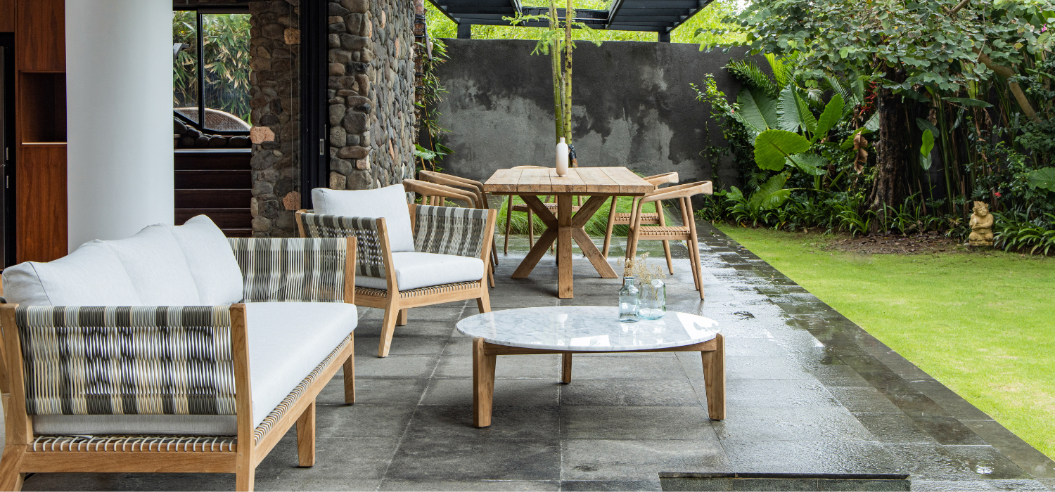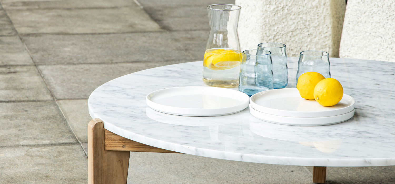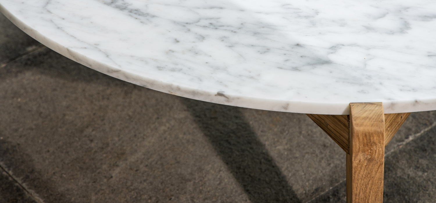 The perfection of the circle encounters the refinement of Carrara marble in this outdoor coffee table inspired by interior designs. A solid recycled teak frame supports the top.