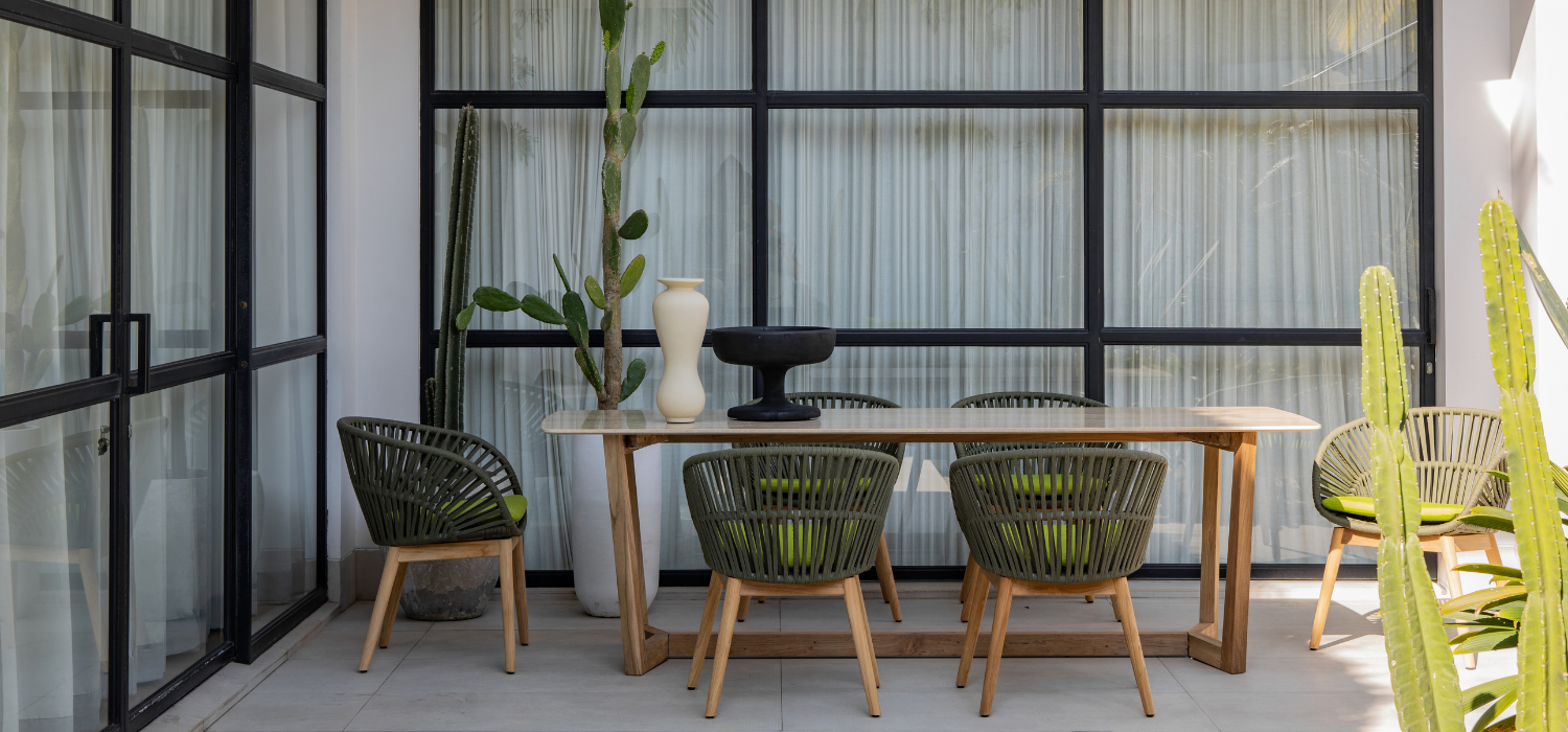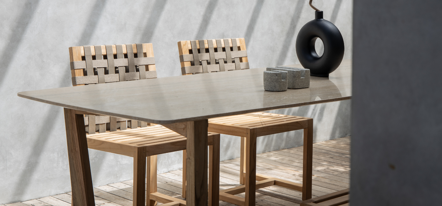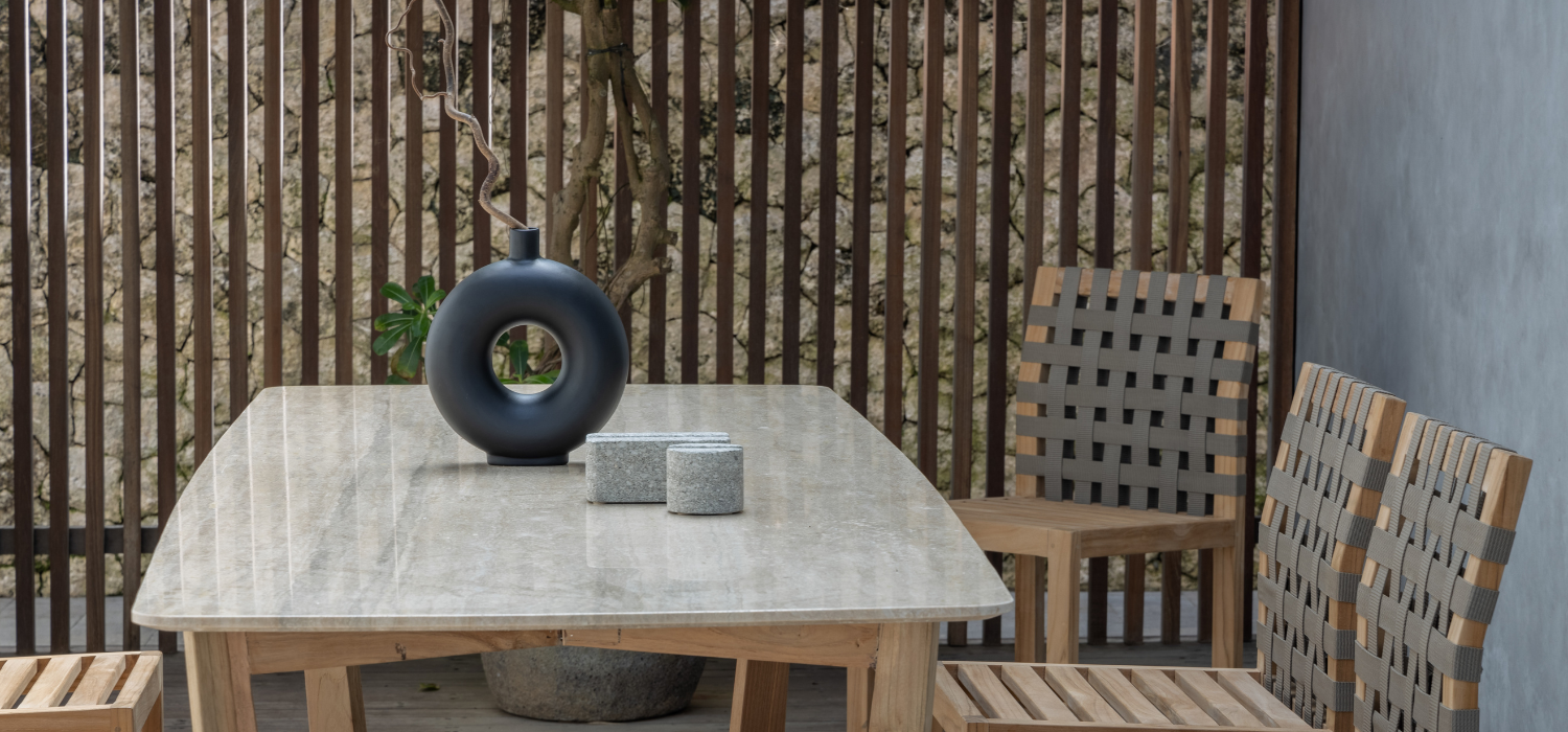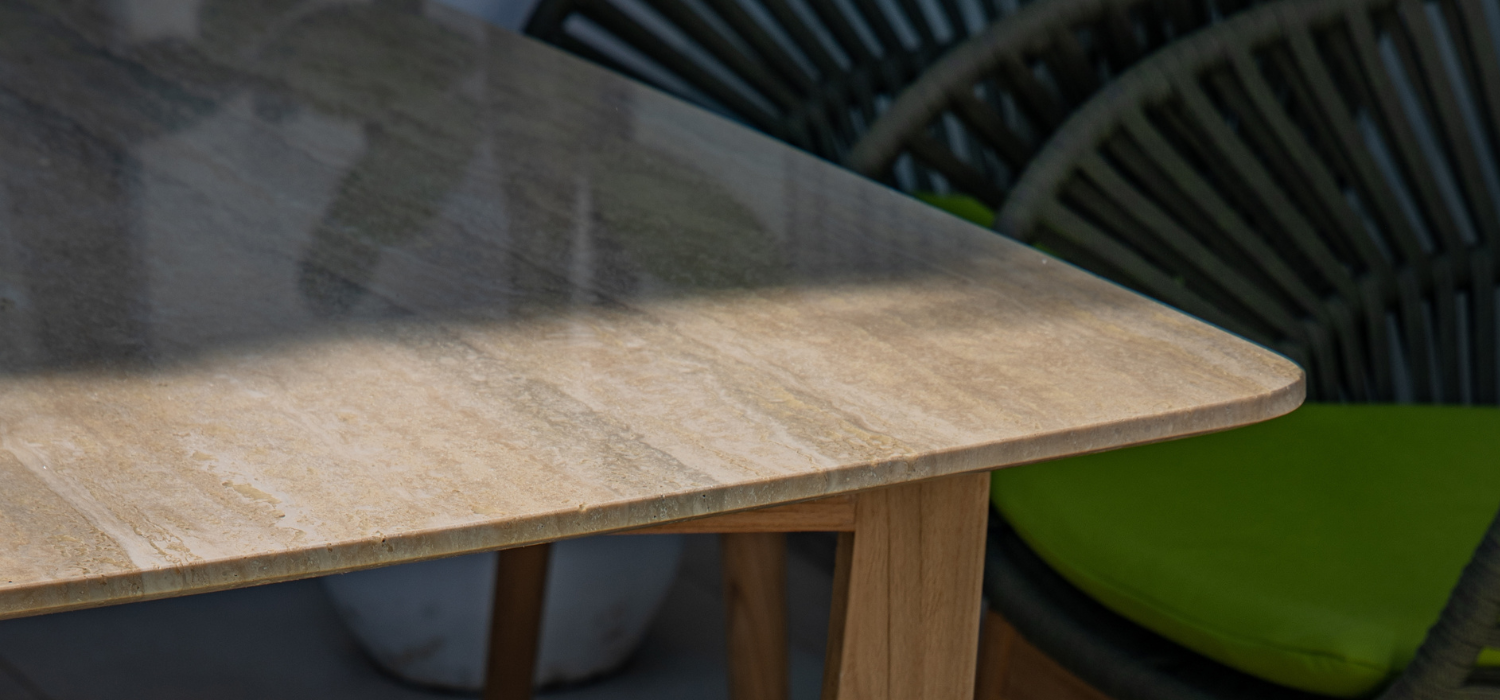 As majestic as a sculpture, the crossed design of the teak wood frame is the distinguishing trait of the Kal collection. The table has a rectangular, Travertino marble top while the coffee table is available in two versions, one in Carrara marble and another in recycled teak with black legs.
