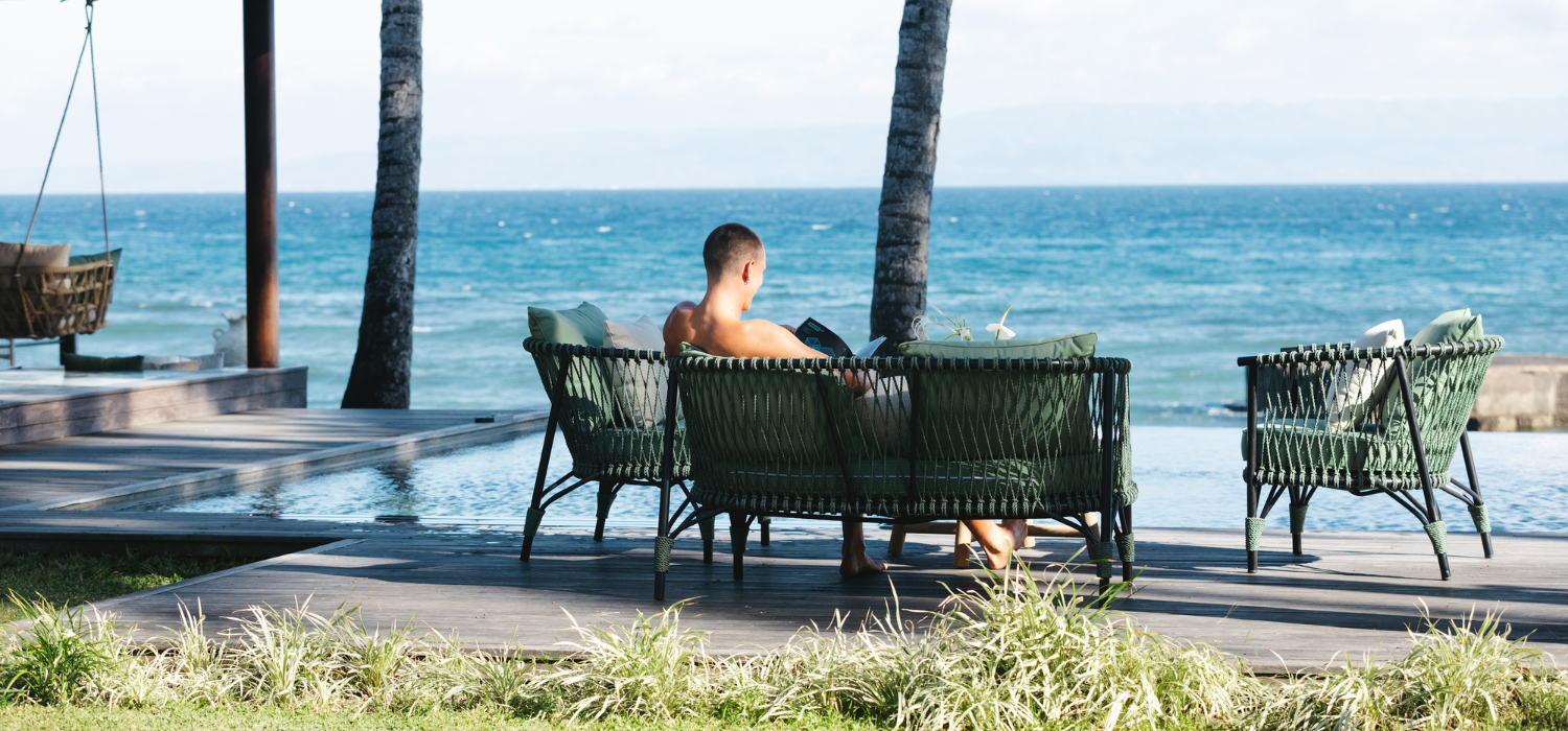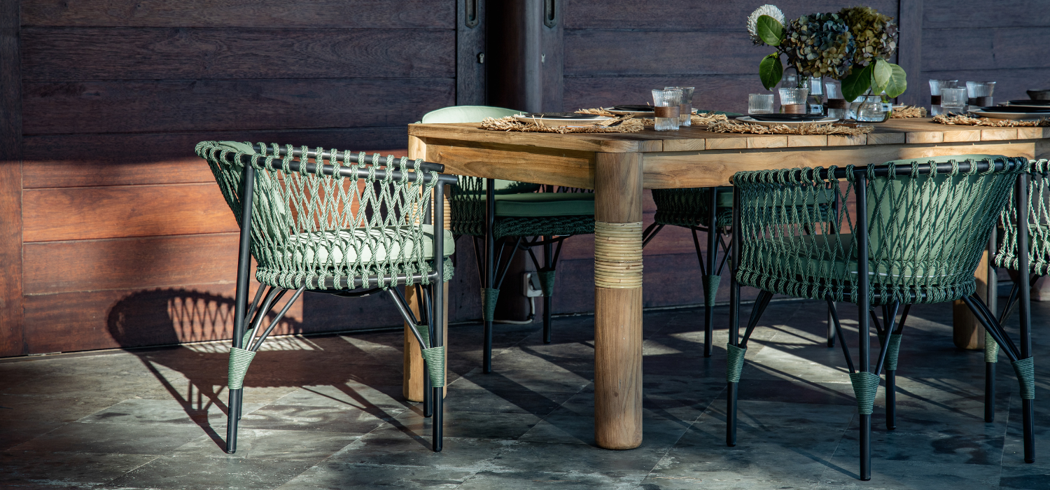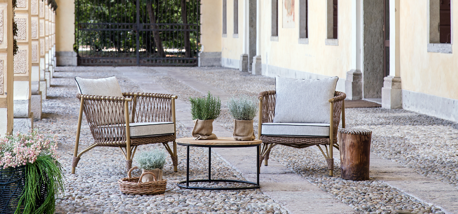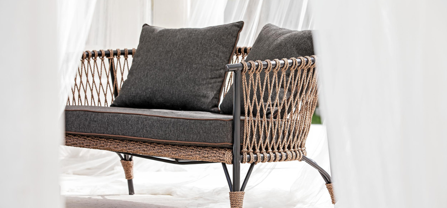 Squeaky sand, a clear blue sky, and crystal-clear water: the Karon collection is inspired by the most beautiful beach in Bali. Made up of a chair, a lounge chair, and two or three-seater sofas, it adds a touch of exotic comfort to outdoor spaces dedicated to conviviality, courtesy of an original diamond-shaped weave and of soft, comfortable cushions that make the seat a pleasure to use.