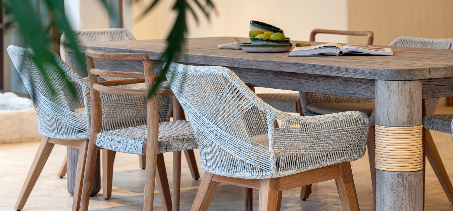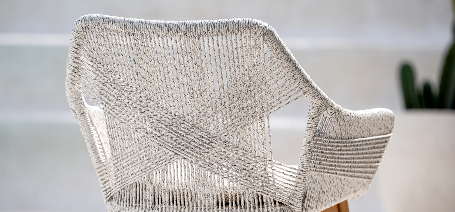 Kristin skillfully enveloped with synthetic rope that lends it a seamless and refined appearance. The wood legs provide sturdy support and add a touch of natural warmth to its overall design. The intricate wrapping technique of the synthetic rope enhances the chair’s aesthetics, creating a tasteful and sophisticated look that complements any dining space.
